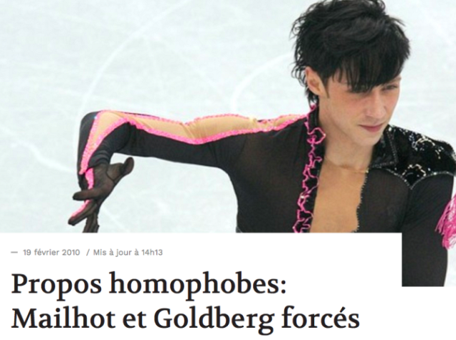 Le patinage n’échappe donc pas aux dérives homophobes de patineurs en mal de reconnaissance, comme en témoigne Le Journal du Dimanche [5] avec les propos de Brian Joubert « Certains patineurs ne nous aident pas. Ils sont efféminés et en rajoutent encore avec des frous-frous. Je me bats contre tous ces chichis, ça m’horripile. Pas étonnant ensuite qu’on passe tous pour des tatas ou des chochottes ». Nous sommes typiquement à la racine de l’homophobie, quand l’identité genrée vacille sur ses repères. Grazia [6] parle de grosse flaque d’homophobie. Et splash.