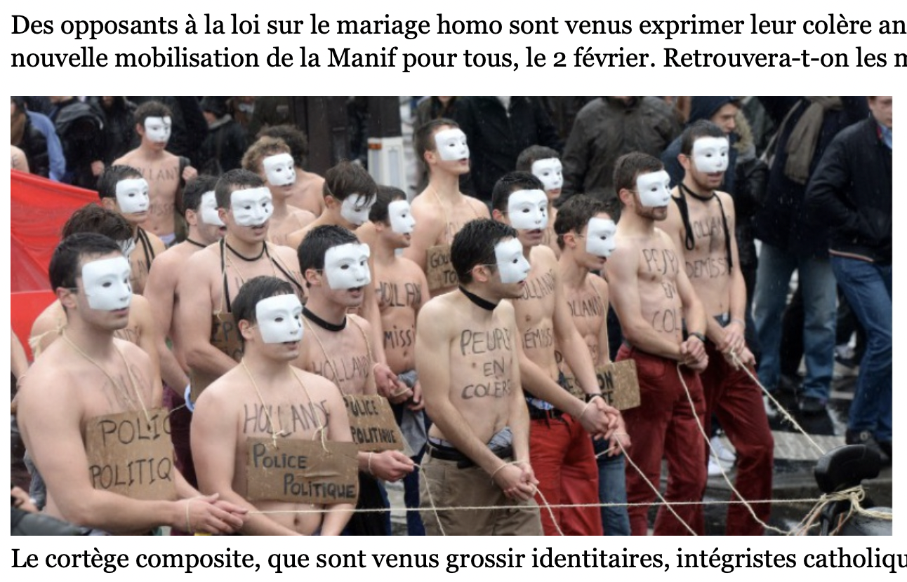 « Paris : la Manif pour tous frappe un grand coup » titre Le Point [41]. Mais pour une manifestation qui se veut « paisible », « douze militants du mouvement étudiant d’extrême droite GUD (Groupe union défense) ont été brièvement interpellés (…) Une demi-douzaine de militants apparentés à la droite identitaire ont également été interpellés ». Pour Le Figaro [42], « la Manif pour tous reprend le combat (…) Fini les ballons et les cotillons, la Manif change de ton. Une "zone de silence" est même prévue, le long d’une avenue entière, pour rendre un peu plus solennel ».