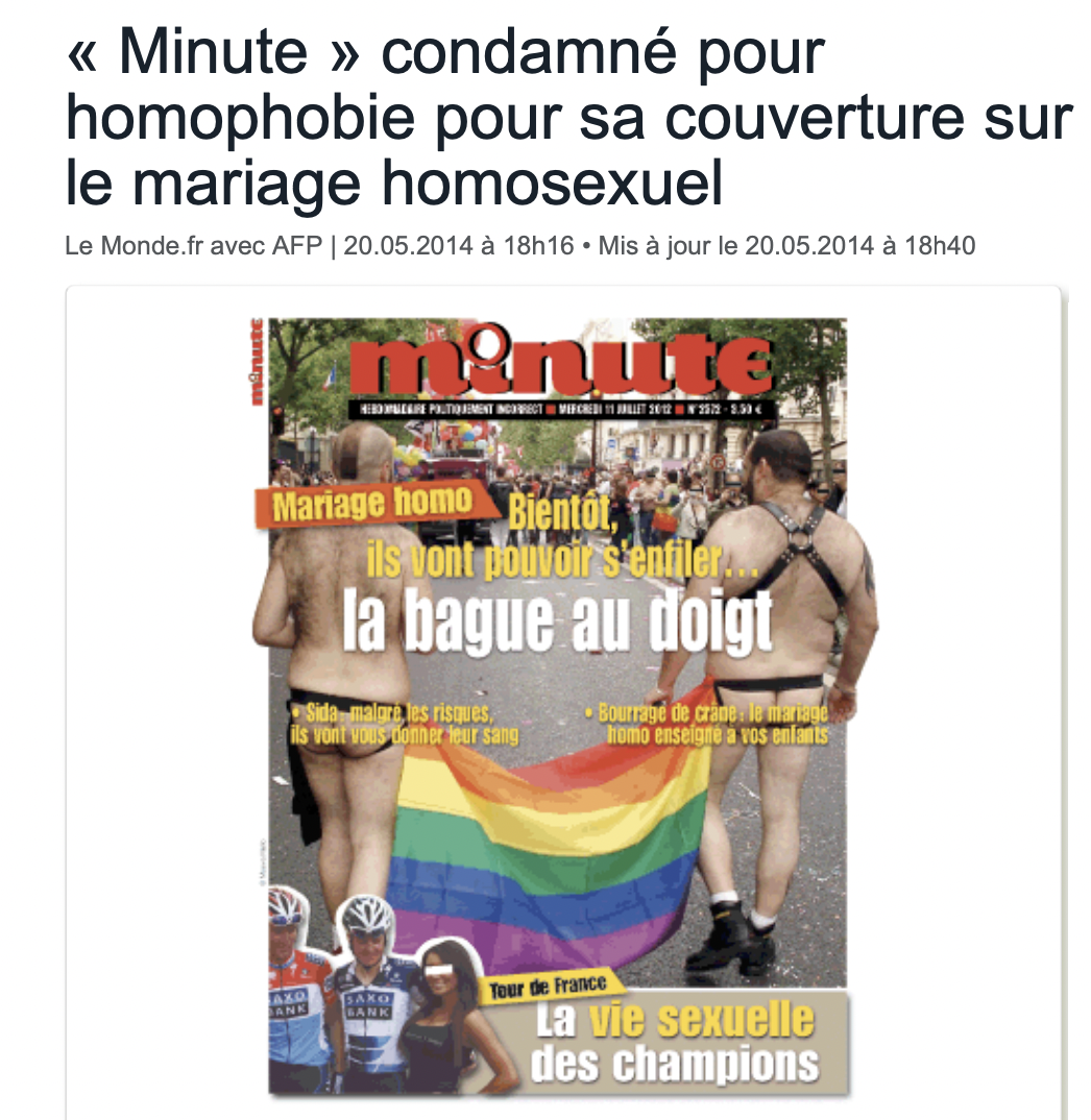 « L’hebdomadaire Minute a été condamné pour homophobie, mardi 20 mai, pour ses titres « Mariage homo : bientôt ils vont pouvoir s’enfiler... la bague au doigt » et « Sida : malgré les risques ils vont vous donner leur sang », en couverture d’un numéro de juillet 2012 » n’oublie pas Le Monde [47]