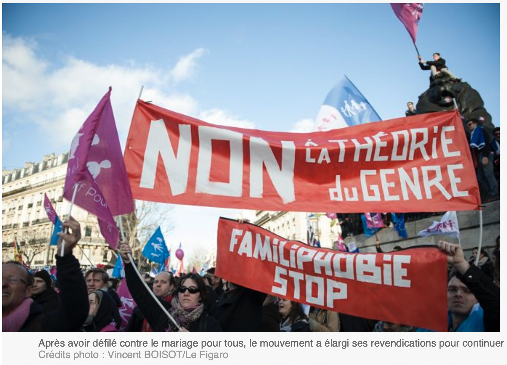 Le Nouvel Obs [43] à la rencontre des manifestants : « "L’intérêt supérieur de l’enfant" est invoqué par tous », ils marchent « par "conviction personnelle" bien qu’étant "croyante". C’est ce que diront tous les intervenants interrogés », « "Non à l’idéologie du genre qui avance sournoisement, non à la pensée unique, non au bouleversement de la civilisation", crie une jeune fille au mégaphone, perchée sur un camion. Officiellement, la manifestation s’oppose à d’éventuels projets de la loi sur la GPA ou la PMA, qui ne sont pourtant pas au programme officiel du gouvernement ». Ils dénoncent « une supposée "familiophobie" du gouvernement ». Christine Boutin « dit avoir peur qu’on "fasse croire à mon fils qu’il peut devenir une fille et réciproquement " ». Effectivement, comme pour beaucoup d’autre « la nouvelle toile de fond cette saison 2 est l’épouvantail du "genre" ».