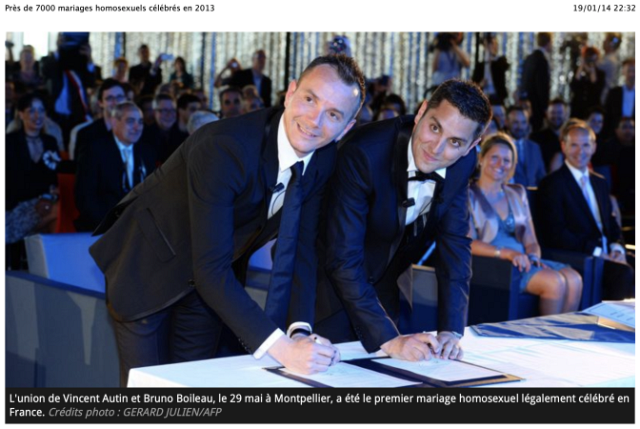 « 7 000 mariages homosexuels ont été célébrés en 2013 » d’après le compte de l’INSEE rapporté par Le Monde [139] « Des mariages qui, après des mois de débats houleux ponctués de manifestations, ont eu lieu dans un calme paradoxal. Aucune cérémonie n’a été empêchée par des manifestants hostiles. Seuls quelques élus ont refusé d’appliquer la loi ». C’est donc 3% des mariages sur l’année, 14% pour Paris, et « trois couples sur cinq sont des hommes ». Dépêche AFP reprise par France 24 [140], 20 Minutes [141], TF1 [142], Toulouse 7 [143], Le Figaro [144], Le Nouvel Obs [145], France 3 [146], La Dépêche [147], le JDD [148], le Huffington Post [149], le Télégramme [150], Métronews [151], 20 Minutes [152], l’Express [153], la Croix [154], la Nouvelle République [155]… et Libération [156], qui ose écrire un article à charge contre Christiane Taubira pour avoir répondu imprécisément sur les chiffres.
