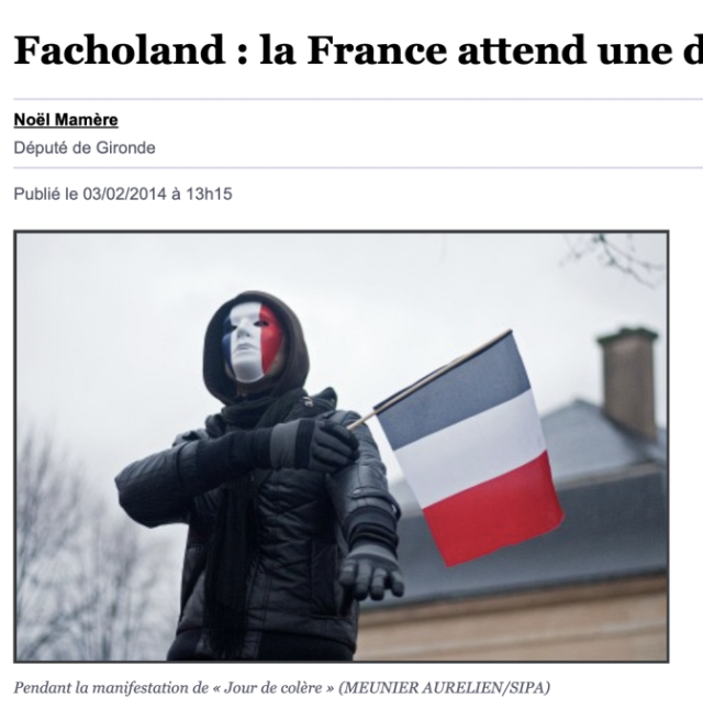 Laurent Provost du Huffington Post [28] se demande « qui se cache derrière la manifestation du 26 janvier contre le gouvernement », qui serait « un mystérieux collectif qui mobilise les Français sur Internet depuis novembre 2013 », dont les organisateurs « se cachent eux aussi derrière pseudos et pancartes pour piloter événement », et qui ne ne se limitent pas aux soutiens de la Manif pour tous. La protestation rassemble toutes sortes de revendications anti François Hollande. Slate [29] a réussi à en faire le tour presque complet : Collectif Pour l’Enfant, Hommen, les Gavroches, Nationalité-Citoyenneté-Identité, La Ligue francilienne, le Réseau-Identité, Comité de Lépante, Reconquête républicaine. Civitas, SOS Tout-petits, Dieudonné, Christian Vanneste. Libération [30] évoque « une soixantaine d’associations ».
